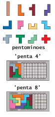 oder die Puzzle-Teile sind "sogenannte Pentominos" aus 5 Einzelwürfeln, welche richtigerweise als (flache) Pentakuben/Pentacuben bezeichenet werden müssten; mit diesen Puzzle-Teilen von diesen Kataminos können somit ausserhalb des Katamino-Spielbrettes auch alle Aufgaben (zwei- und dreidimensionale, 2D- und 3D-, Flächen- und Raum-Puzzles) des Pentomino-Puzzles gelöst werden.