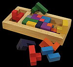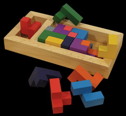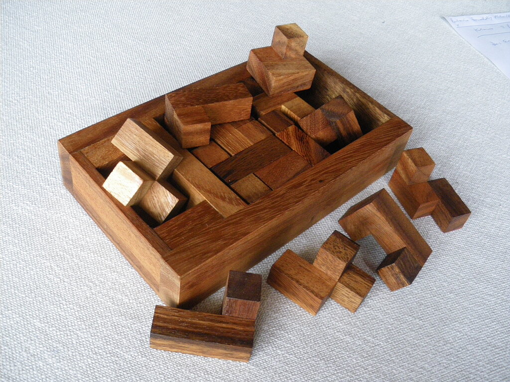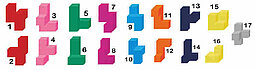 Die besondere Herausforderung dieser 3D-Puzzles besteht darin, sich in den dreidimensionalen Raum hineinzudenken und die 16 Puzzleteile so zu platzieren resp. zu kombinieren, dass kein Hohlraum übrig bleibt und alle Teile im "grossen Raum" oben flach abschliessen.