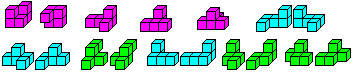 Aus 5 Einzelwürfeln können auch 17 verschiedene dreidimensionale/räumliche Pentacuben erstellt werden, und zwar 5 symmetrische Pentacuben und 6 Pentacuben mit je einem entsprechenden Spiegelbild (wenn jeweils ganze Einzelwürfel-Seitenflächen zusammengefügt werden); diese 17 Teile werden auch als Superquints oder Super Quintillions bezeichnet, hier zwei verschiedene Darstellungsarten: