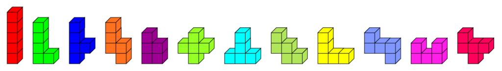 Alle 12 Pentomino-Figuren umfassen somit insgesamt 60 (12 x 5) Einheitsquadrate und haben folgende Formen: