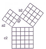 Lehrsatz: "Im rechtwinkligen Dreieck ist die Summe der Kathetenquadrate gleich dem Hypotenusenquadrat". Dieser im Prinzip schon den alten Babyloniern, Sumerern, Aegyptern und Indern vertraute Lehrsatz wurde durch den griechischen Philosophen Pythagoras (570 - 496 v. Chr.) bekannt gemacht und nach ihm benannt.